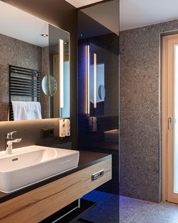- Modernes Badezimmer mit Dusche, Föhn und hochwertigen Pflegeprodukten